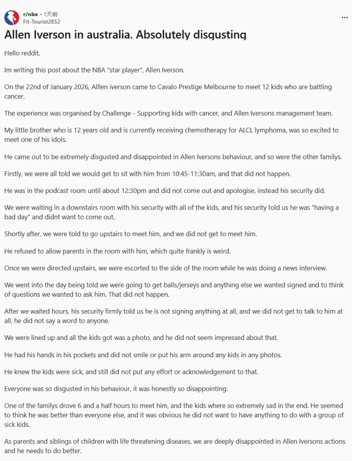 其中一个家庭透露,他们单程驱车超6小时赶来,只为让身患癌症的孩子见到偶像,最终却感受到艾弗森“完全没有兴趣出现在这里”的敷衍。这个帖子迅速引发热议,网友纷纷谴责艾弗森漠视抗癌儿童的期待,违背慈善初心。